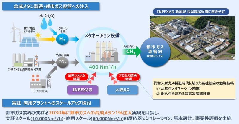 2019年には国際石油開発帝石株式会社(INPEX)と共同で、新潟県長岡市の越路原プラント敷地内にメタネーション試験設備を完成させました。この設備では、天然ガス生産時に付随して出されるCO₂と、水の電気分解によって製造された水素を合成することによりメタンを製造します。